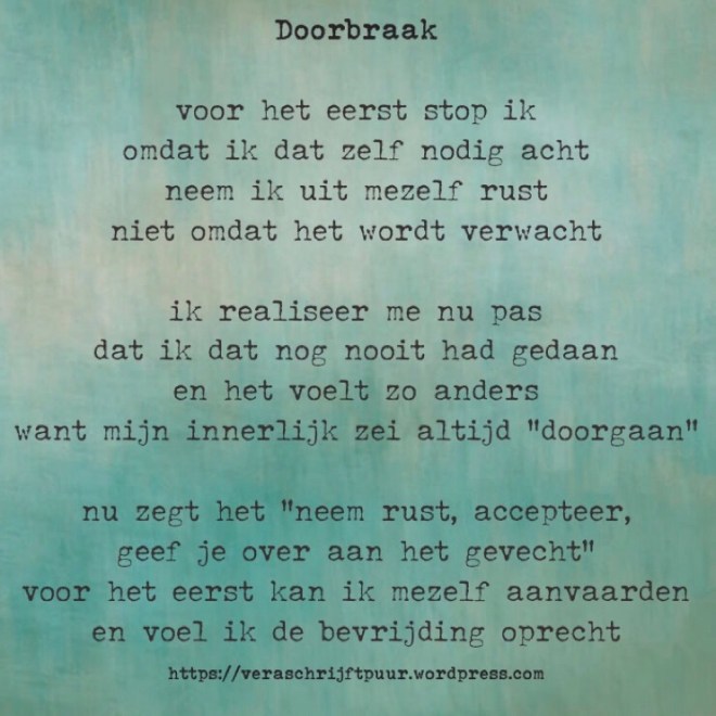 In de afgelopen jaren heb ik mezelf dusdanig overvraagd dat ik nu niet in staat ben om een reguliere baan aan te kunnen. Niet eens part-time. Mijn dagindeling is heel gestructureerd met weinig op de planning, en een stukje vrijwilligerswerk. Heel langzaam krabbel ik weer op, met de daarbij gepaarde ups en downs. Hoe het straks zal gaan daar heb ik geen idee van, maar dat heb ik ook los kunnen laten. Dit is het, en het is zoals het is. Natuurlijk kan ik er van balen, maar ik ben ook wel blij dat ik al wat vrijheid kan ervaren om mezelf gewoon te laten zijn.